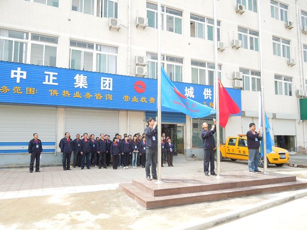2012年4月28日,泰安市中正東城供熱有限公司辦公場(chǎng)所喬遷,現(xiàn)場(chǎng)進(jìn)行了隆重的首次升國(guó)旗、司旗儀式。集團(tuán)公司領(lǐng)導(dǎo)到場(chǎng)祝賀并對(duì)其現(xiàn)場(chǎng)環(huán)境整治情況進(jìn)行了檢查驗(yàn)收。